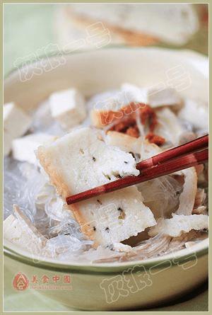 3、将锅盔切片、豆腐切片、粉丝温水泡软,图5;