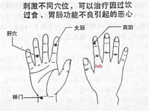 吃了腐败不洁的食物和没熟透的水果,或是因机体疲劳、精神紧张等原因引起的恶心和呕吐,不可避强止呕, 能吐则应尽量吐出, 此时, 应用提高胃肠功能和促进消化吸收的穴位, 这些穴位都在食指上。