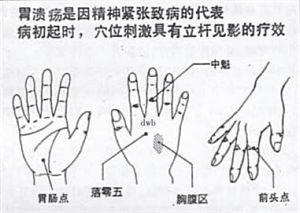 治疗胃溃疡的穴位: 胃肠穴, 手背的胸腹区,食指上的前头穴, 中指的中魁穴, 每天用香烟灸这些穴位 7- 14 次, 能抑制胃酸分泌。 所以胃的情况会渐渐变好。