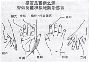 具体治疗方法: 位于食指的二间穴、手掌的鱼际穴、手腕的太渊穴三个穴位。 在感冒初期, 用这三个穴位治疗,可很快治愈。 把六到十二根牙签扎成一束, 用强刺手法治疗。