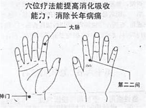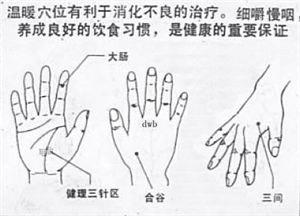 具体治疗方法: 治疗消化不良的区带是手心稍下的健理三针区, 因为该区是提高以胃肠为主的各种内脏功能的特效区带, 如给予充分的刺激, 一定会提高胃肠消化能力和整个内脏的功能, 再加刺食指根部附近的三间穴、食指第一关节掌側的大肠穴和合谷穴, 胃的消化功能就会不断提高, 温暖这些穴位, 香烟灸最好。