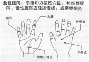 此外,食指的大肠穴, 小指的肾穴,手背的外劳宫穴,手掌的的健理三针区等对治疗腹泻也很有效。