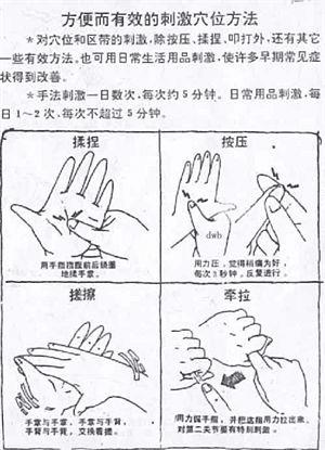 按摩的穴位: 手掌区、 中冲、 心包区。 中风后遗症