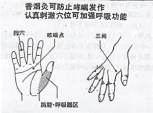 具体治疗方法: 手掌上有许多治疗哮喘有效的穴位。 哮喘穴, 位于食指中指分岔处的手掌上。 该穴是治疗哮喘穴位中最为有效的穴位, 哮喘发作时, 应首选此穴, 在家里, 用香烟灸很有效。 感到烫时, 把香烟从穴位上方移开, 隔一会儿, 再灸一次, 共灸 8 --16 次, 哮喘发作便会止祝
