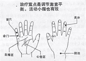 具体治疗方法: 其要点有二: 一是促进激素分泌,提高生殖器官机能, 二是消除心中疑虑。 提高生殖功能可刺激小指第一关节掌侧的肾穴; 加刺位于肾穴之下的命门穴, 手掌小指侧的生殖区, 手背的阳池穴;手掌中央的心包区、无名指指甲旁的关冲穴, 对安神宁心, 调节植物神经也有效。 每天用香烟灸这些穴位和区带 8-10次,同时在做家务活的空闲时间里, 认真仔细地按压这些穴位和区带, 更年期的种种症状一定会减轻。