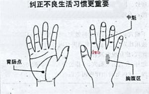 具体治疗方法:治疗烧心的穴位疗法, 是手背中央的胸腹区和中指第二关节背侧的中魁穴。还有手掌下的胃肠点穴,用力按压这几个穴位或揉搓区带 每天做 7-10次, 如果再配以香烟灸,效果会更好。