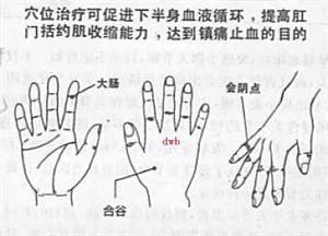 具体治疗方法: 用香烟灸会阴穴, 由于使肛门括约肌受到锻炼, 提高了肌力, 所以能很好地止住出血。 每天早晚灸 15 --30 次, 一定要耐心仔细地灸, 才能收效, 除会阴穴外, 手背上的合谷穴和手掌侧食指第一关节的大肠穴也是治疗痔疮的好穴位。 用手指按压这两个穴, 也会很快收效的。