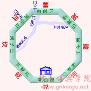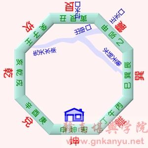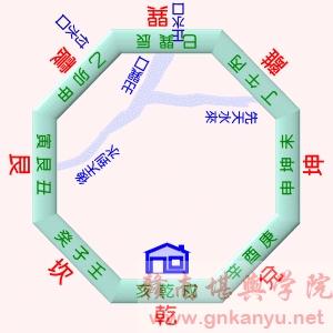 坐坤向艮.艮卦之先天位居於後天八卦之乾卦,則坤卦之賓水位在於乾卦戍乾亥方。