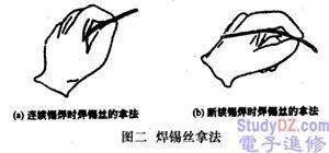 ??焊锡丝一般有两种拿法,如图二所示。由于焊丝成分中,铅占一定比例,众所周知铅是对人体有害的重金属,因此操作时应戴手套或操作后洗手,避免食入。