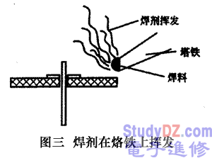 ??如图三所示,当我们把焊锡融化到电烙铁头上时,焊锡丝中的焊剂伏在焊料表面,由于烙铁头温度一般都再250℃-350℃以上,当烙铁放道焊点上之前,松香焊剂将不断挥发,而当烙铁放到焊点上时由于焊件温度低,加热还需一段时间,在此期间焊剂很可能挥发大半甚至完全挥发,因而在润湿过程中由于缺少焊剂而润湿不良。同时由于焊料和焊件温度差很多,结合层不容易形成,很难避免虚焊。更由于焊剂的保护作用丧生后焊料容易氧化,质量得不到保证就在所难免了。