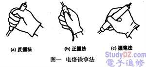 通常握持电烙铁的方法有握笔法和握拳法两种。