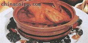 2、取砂罐一个放入土鸡、葱段、姜,炖至鸡肉酥烂用调料调味。