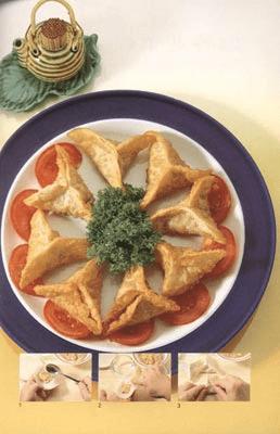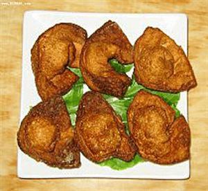 1、每张馄饨皮包入馅料,折成抄手式馄饨,再放入热油中炸熟,色泽微黄时捞出。