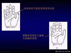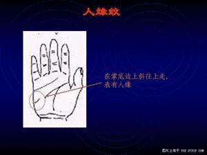 若婚姻纹超过六条,而且找不出主线,则婚姻关系较乱婚姻纹长,择偶条件苛,对配偶的要求也高,婚姻上会有压力.