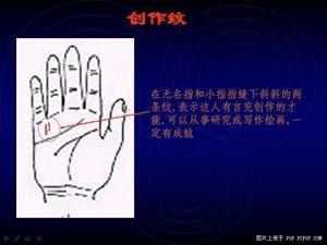 在无名指和小指指缝下斜斜的两条纹,表示这人有言究创作的才能,可以从事研究或写作绘画,一定有成就