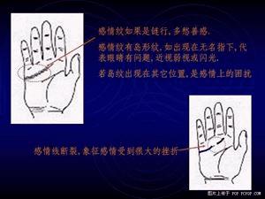 感情纹有岛形纹,如出现在无名指下,代表眼睛有问题,近视弱视或闪光.