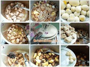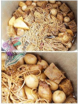 5-9、加入足量温热水,加精盐、调料粉,下独头蒜、面筋、豆丝、鹌鹑蛋,盖盖儿,加阀,开焖