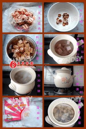5、转小火微沸,一个半小时。(中间我加盖了超市里买来的滤油布,帮助去掉一些油份,没有的话可以不用。)