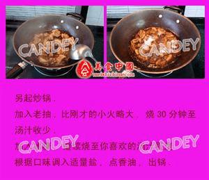 6、转入炒锅中(不必盛入太多汤,略和肉块一样高就可以了),倒入老抽一大勺,中火烧30分钟至汤汁收浓。