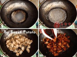 3、加入清汤、盐、味精、白糖、老抽王、棱角肉,用小火烧至浓汁熟透时,再用湿粉打芡,铲入碟内。