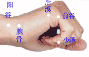 注:后溪穴在手侧面小拇指下两三厘米处,见上、下附图