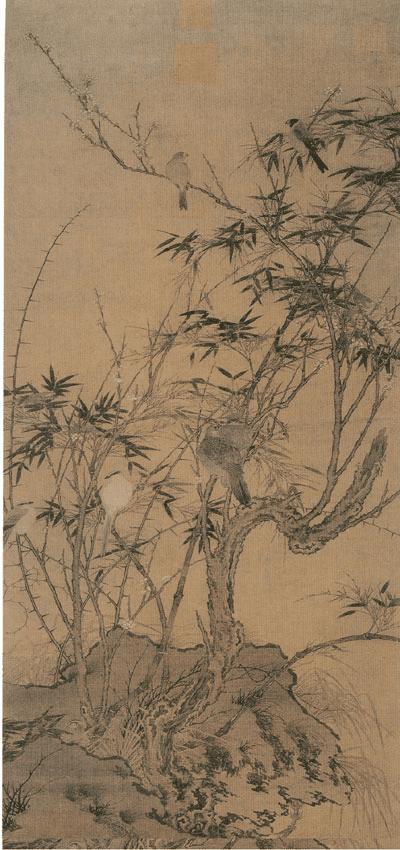 2 为了能较全面的反映这一时期的花鸟画创作,选入了少数非全景画鸟作品,主要为文人画及水墨花鸟画,包括文同、陈琳、盛昌年、王蒙等各别作品。元代水墨花鸟画也予以录入。王冕作品将单独录入“岁寒三友”专题,故均未录入。