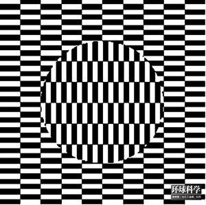 这一系列图片中大部分运动错觉产生的潜在原因都是眼睛运动,包括明显的和细微的。 由欧普艺术家布里吉特-赖利(Bridget Riley)创作的这个图案,当观察者转动眼睛观看图案时,会发现快速的螺旋式运动。