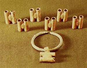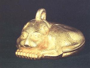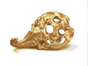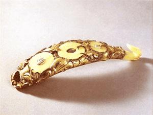 长5厘米,共重17.3克,1979年5月内蒙古自治区准格尔旗西沟畔2号匈奴墓出土,内蒙古自治区博物馆藏。
