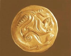 直径约6厘米,重21.2克,1977年新疆维吾尔自治区托克逊县阿拉沟30号匈奴墓出土,新疆维吾尔自治区社会科学院考古研究所藏。