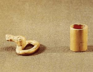 左图最大直径为1.8厘米,重2.2克,右图高1.5厘米,径0.9厘米,重7克,1982年7月陕西省凤翔县马家庄春秋秦宗庙遗址出土,陕西省雍城考古工作队藏。