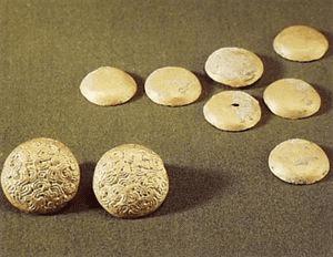 其中两件高3.5厘米,直径2.2厘米,重10.8克,其余高0.2厘米,直径1.82厘米,重5克,1982年7月陕西省凤翔县马家庄春秋秦宗庙遗址出土,陕西省雍城考古工作队藏。