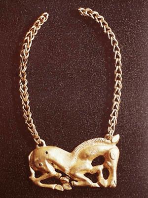 高5厘米,长8厘米,链长13.5厘米,1984年6月内蒙古自治区科尔沁左翼中旗希伯花鲜卑墓出土,内蒙古自治区通辽市博物馆藏。