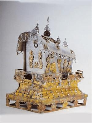 金棺高3.1至4.6厘米,宽2.3至3.5厘米,盖长7.5厘米,棺座长7.1厘米,宽4.6至5.4厘米,重108克,银果高5.4至7.1厘米,宽4.9至6厘米,盖长10.7厘米,果座长10.5厘米,宽6.7厘米至8.4厘米,重349.5克,1964年12月甘肃省靖川县大云寺舍利石函出土,甘肃省博物馆藏。