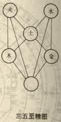 得金华,转而相因。化为白液,凝而至坚。金华先唱,有倾之间,解化为水,马齿阑干。阳乃往和,情性自然。迫促时阴,拘畜禁门。慈母育养,教子报恩。严父施令,教饬子孙。五行错王,相据以生。火性销金,金伐木荣。三五与一,天地至精。可以口诀,难以书传。”图中,火木为汞,水金为铅,土为黄芽。土居中央,表示“三物一家,都归戊己”。火木居左,水金居右,按坎离为易说,左为离,右为坎。水金相通,表示金生水;火木相通,表示木生火。水火居上位,表示水火药物在炼丹中占首要地位。下一白圈,指丹药,即“三五与一”的“一”。所以水火又直通向此白圈。据后人考证,此图式,被道教徒所吸收,五代陈抟无极图中的五气朝元图和周氏太极图中五行顺布图,皆出于此。