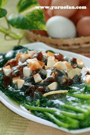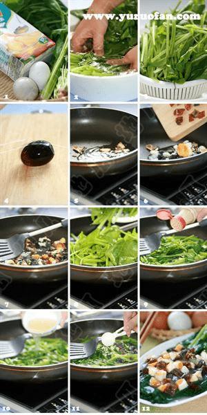 1、将皮蛋和咸蛋蒸15分钟,冷却后去壳切成粒;菠菜洗净后沥干水分;