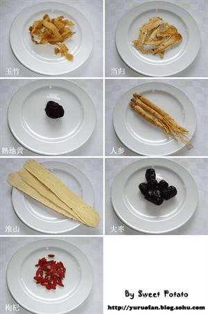 老母鸡1只 香菇6朵 红枣6颗 枸杞1把 玉竹1把 当归6片 黄芪3片 普通小人参3根 熟地黄1粒 生姜6片 料酒1汤匙