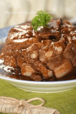 5、将肉片皮朝下地铺入大碗内各边,在肉片上浇些许调好的酱汁然后填入霉干菜,用手压紧一些然后再浇上剩余的酱汁;