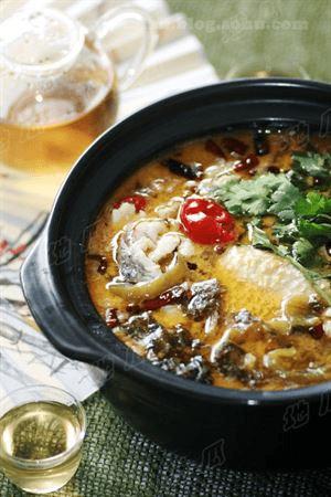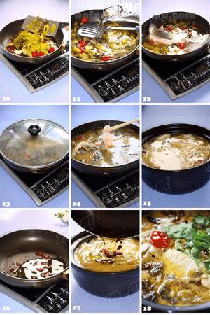 6、轻轻地倒下鱼片烫熟后即可熄火将煮好的酸菜鱼倒入一个大碗或砂锅内(建议使用砂锅,请注意附后的小贴士);