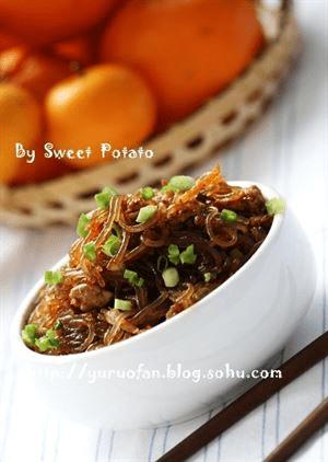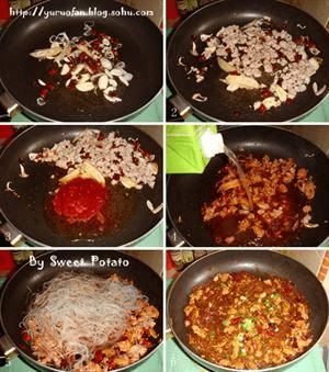 4、倒入高汤后,放入事先泡软的粉丝一起翻炒至汤汁收干,最后调入老抽撒入花椒粉、味精和葱花炒匀即可。