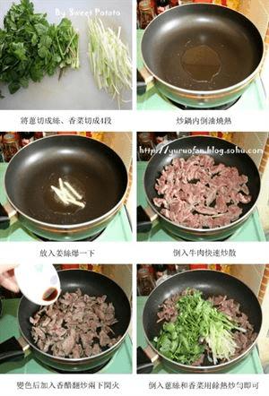 5、当牛肉变色后,加入香醋快速炒匀后熄火然后放入香菜和葱丝,利用余热把香菜和葱丝炒软即可。