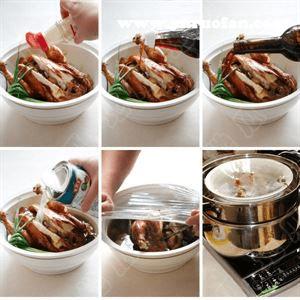 6、将装满肉的碗放入蒸锅内蒸35分钟,然后将菜里的汤汁滤出备用,将菜倒扣入一个盘子里;