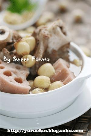 3、莲藕用刀刮去表皮后去掉莲蒂,切滚刀成块状,把切好的莲藕放入汤煲内一起炖30分钟后放入泡发好的莲子再用小火炖30分钟,熄火前调入适量盐即可。