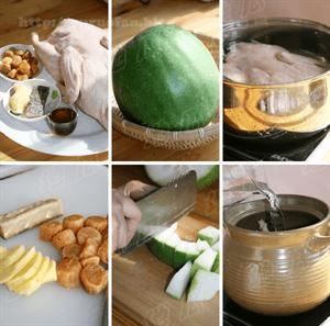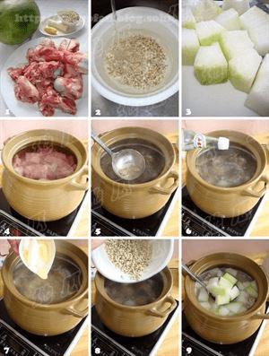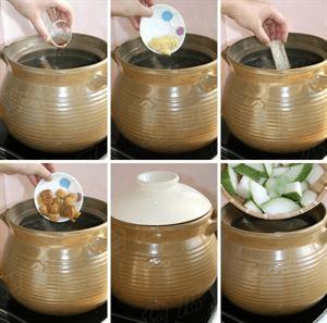 3、水开后一次放入黄酒、生姜、咸鱼干、瑶柱,略为搅拌后盖上锅盖转文火煲3小时,食用前10分钟倒入冬瓜煮软并调入少许盐调味即可。
