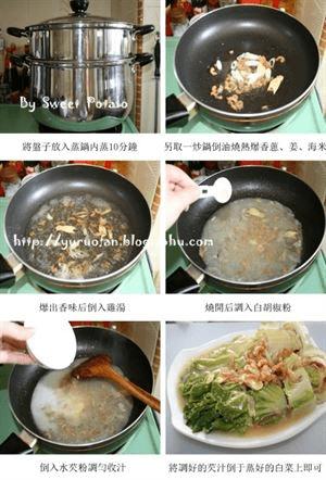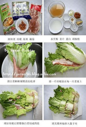 娃娃菜2棵 长条培根一袋 海米一把 清鸡汤1碗 生姜2片 葱白一小段 白胡椒粉1/3茶匙 水芡粉少许