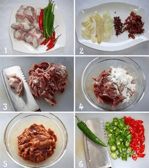 鸭胗或鸡胗300克 青椒5根 红尖椒5根