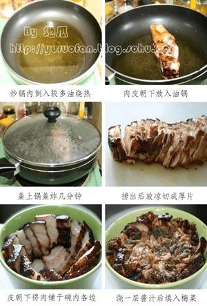 带皮五花肉1块、梅菜1把、豆豉1勺、红腐乳1块、八角2粒、姜5片、蒜头5粒、白糖l.勺 料酒l汤勺、黑酱油l勺、生抽少许、生粉适量