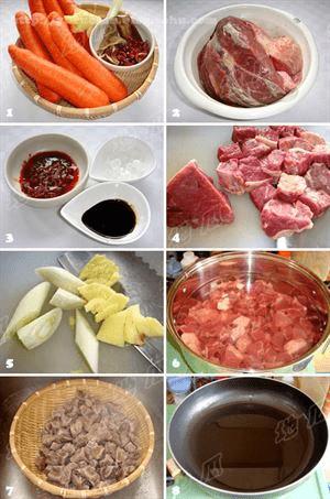 牛腩2斤 胡萝卜4根 生姜1小块 大葱1段 香叶5片 桂皮1块 陈皮1块 草果1枚 八角2粒 干辣椒5根 冰糖10粒 老抽2汤匙 豆瓣2汤匙 香菜适量