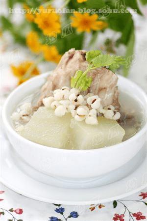 冬瓜500克、排骨300克、腔骨1根、薏米100克、大葱1段、生姜1小块、醋2滴、盐少许