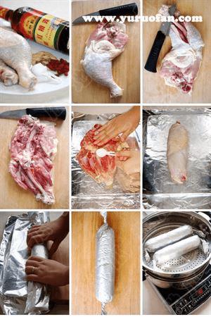 2、将鸡腿去骨后,皮朝下放在锡箔纸上,抹上少许盐后卷起来,并用锡箔纸裹紧呈糖果状,放入蒸锅内大火蒸20分钟。
