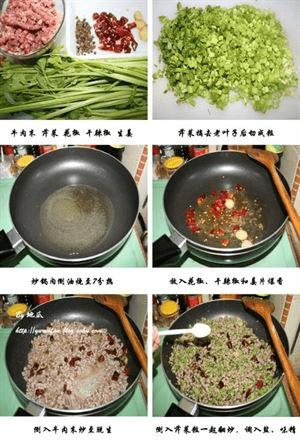 3、倒入牛肉末大火翻炒至脱生,然后倒入芹菜粒一起翻炒2分钟,调入盐和味精即可起锅。